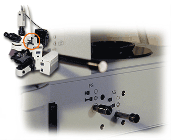 LIGHT PATH SELECTOR KNOB AND FIELD AND APERTURE IRIS DIAPHRAGM ADJUSTMENT KNOBS The long metal rod (Light Path Selector Knob) below adjusts the amount of light that can enter the eyepieces or the camera. It has three settings - all eyepiece, both, or all camera. The two knobs below the Light Path Selector Knob adjust the uniformity of the fluorescence illumination of the sample in fluorescent microscopy. |